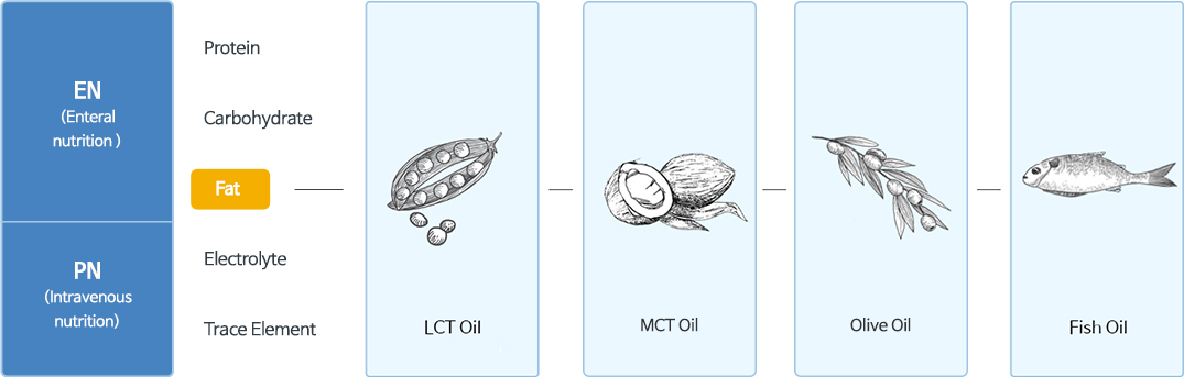 Lipids are components of cell membranes in the human body and play a role in energy supply, intracellular signal transduction, and essential fatty acid supply. Soybean oil, medium-chain triglyceride oil, olive oil, and refined fish oil are used for nutritionally used lipids. Soybean oil has been developed relatively commercially and has been used until now, but it has been suggested to promote inflammation due to the inclusion of omega-6 (Linoleic acid, Arachidonic acid). In addition, since the 1980s, a method of replacing a portion of soybean oil with medium-chain triglycerides has been proposed for the rapid dissemination of energy sources. Since then, olive oil rich in omega-9 (Oleic acid) and refined fish oil rich in omega-3 (EPA, DHA) have been used in intravenous nutrition and known to have anti-inflammatory effects.