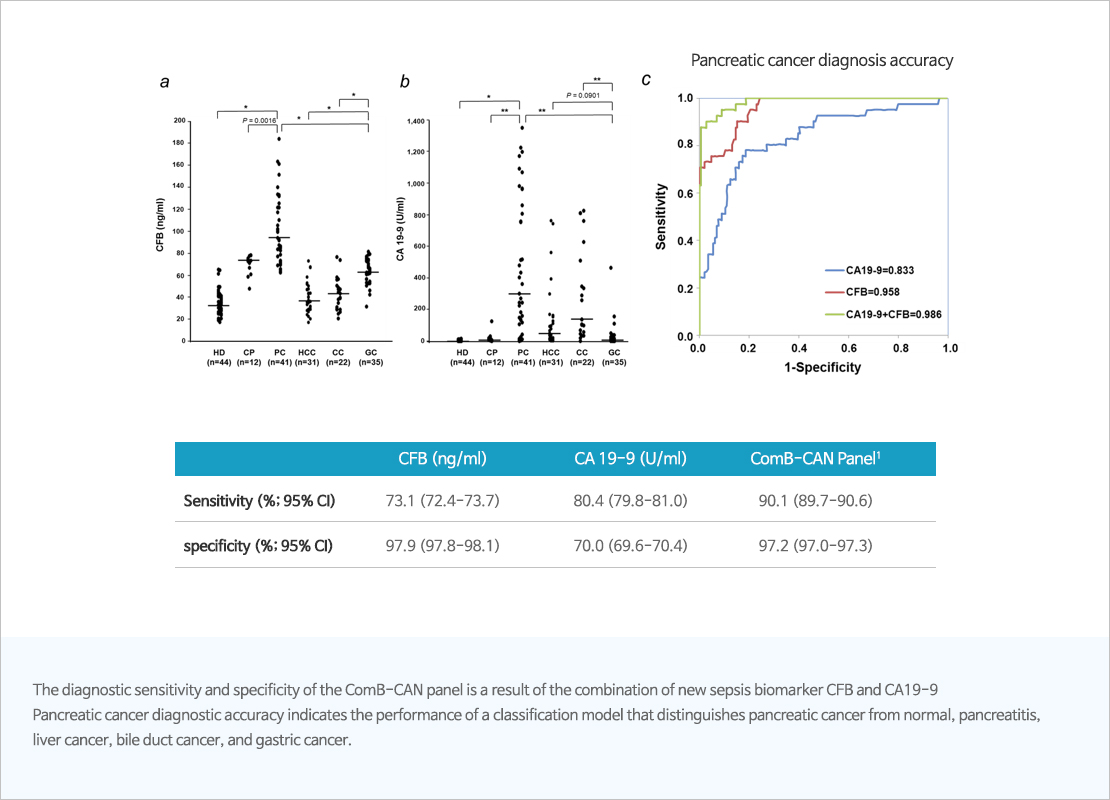 - When combined with the existing pancreatic cancer biomarker CA19-9, CFB improves diagnostic accuracy of pancreatic cancer.