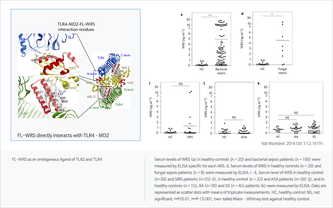 Sepsis refers to organ failure caused by disorders of the body's immune response regulation caused by infection, and is one of the high mortality diseases with 30 million cases worldwide each year. It is the most common disease in the intensive care unit in Korea. Currently, rapid response and continuous monitoring through early diagnosis are the only way to reduce sepsis mortality. WRS is a type of aminoacyl tRNA synthetase (ARS) that is primarily responsible for the synthesis of proteins in the body. In 2016, the world's first new cell regulatory network was identified at Nature microbiology, demonstrating its potential as a sepsis diagnostic biomarker. In this paper, we found that WRS is rapidly expressed in sepsis patients and can be diagnosed as sepsis due to various infections (bacteria, fungi, viruses). In-house clinical studies have shown that WRS reflects sepsis severity as well as high diagnostic accuracy.