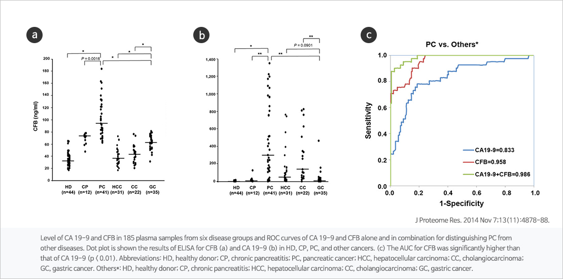 The technology for multi-viomarker analysis using the new pancreatic cancer biomarker, B (CFB) and CA19-9, has been found to improve the accuracy of the existing pancreatic cancer diagnosis biomarker, CA19-9. In addition, early diagnosis of pancreatic cancer has been proven possible.