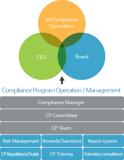 The JW appoints a compliance manager for each affiliated company, and grants authority and responsibility for the operation and Compliance program. Particularly JW Pharmaceutical, the CEO directly acts as a Compliance Manager, while JW Holdings operates as a joint compliance manager and cooperates with the JW Holdings CP Team to operate a Compliance program, and reporting directly to the board of directors as the basic frame of the CP Business. In addition, the Compliance Committee, which consists of the CEOs of JW affiliates and the head of the business division, we share various CP issues and control company-related violation risks.