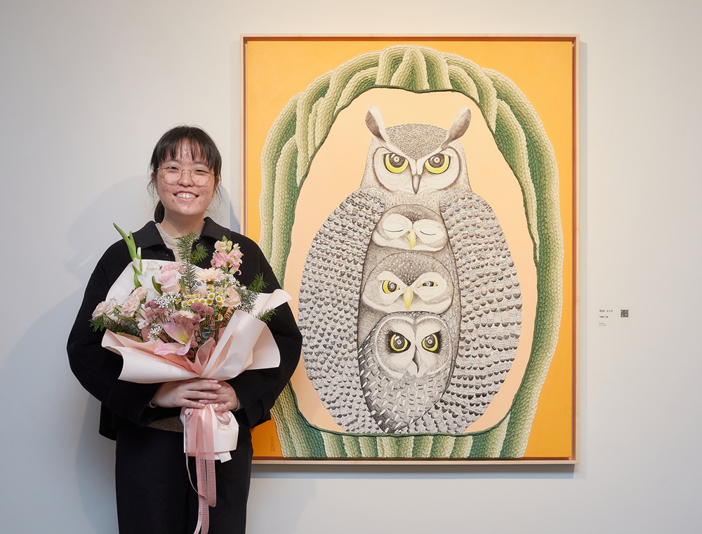 A. 원래부터 선인장과 부엉이가 펜 세밀화를 그리기에 좋아서 자주 그렸다. 그러다 점점 선인장과 부엉이를 조합해서 그리게 됐다. 우리 가족을 ‘부엉이’로 표현하고 ‘선인장’은 가족을 지켜주는 보금자리로 표현하는 것을 좋아한다. 이번 수상작품에서도 날개를 펼치고 있는 가장 큰 부엉이가 아빠, 두 번째 부엉이가 동생, 세 번째가 나, 그리고 가장 아래에 있는 부엉이가 엄마다. 선인장 집에서 아빠 부엉이가 가족을 지켜주고 있다는 의미를 담아 그렸다. 엄마 부엉이는 밑에서 가족을 든든하게 받쳐주고 있다는 것도 표현해보았다.